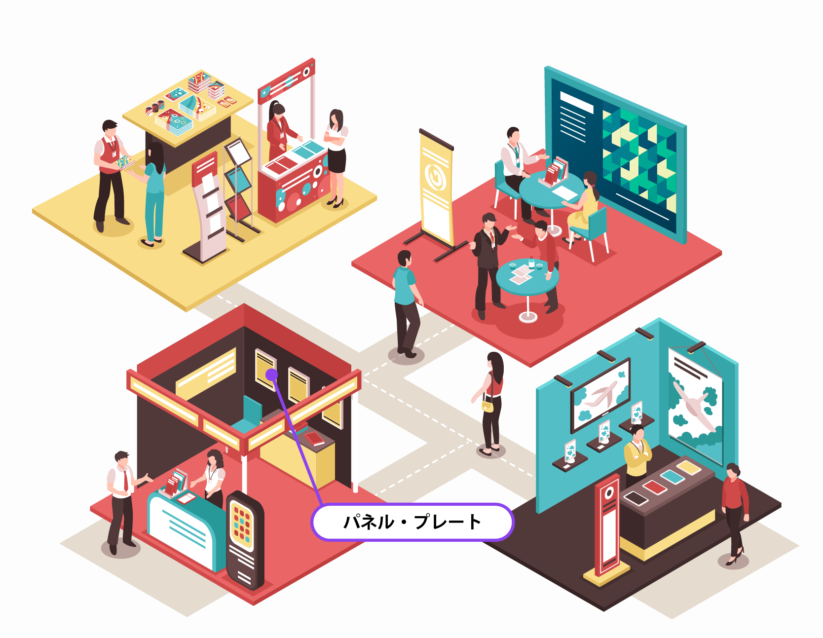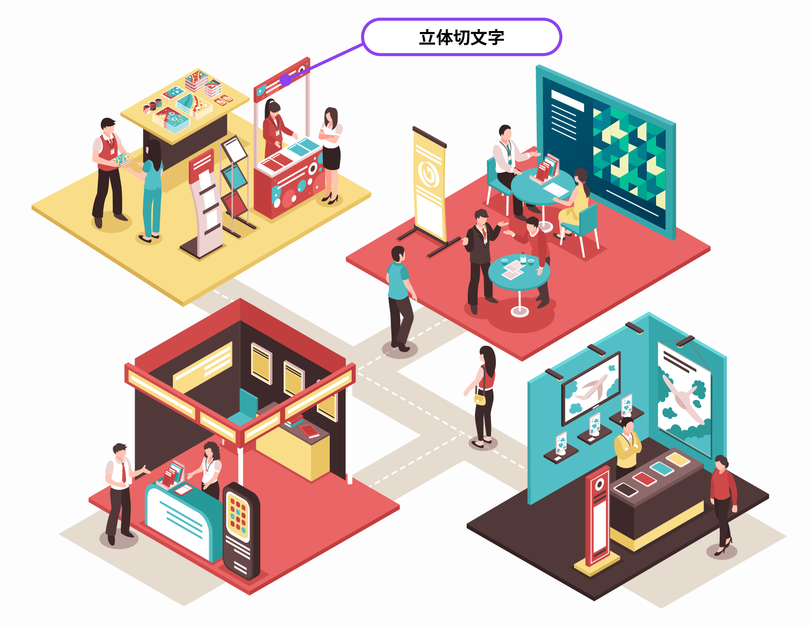 展示会向けの立体切文字は、厚み10〜50mmの発泡素材等で立体感を演出し、遠くからでも視認性抜群です!軽量で設置も簡単。ブース全体の印象を高め、来場者の注目を集めます。カラーやロゴも自由に再現可能です。